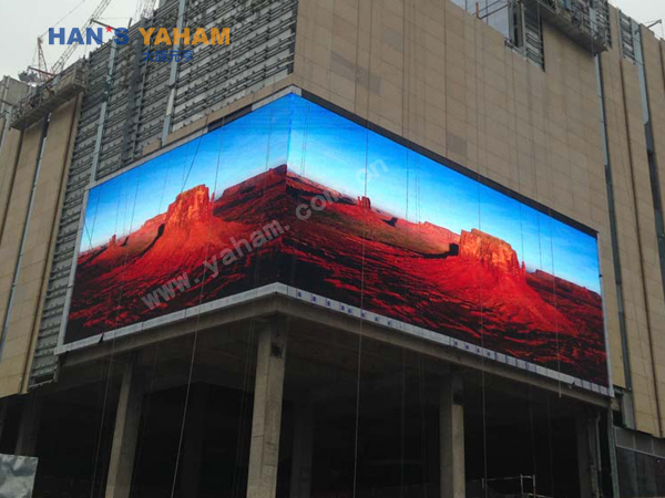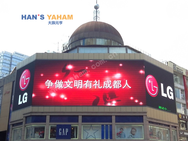 該LED大屏幕大氣震撼的外表下蘊(yùn)含著元亨光電研發(fā)團(tuán)隊(duì)精彩絕倫的創(chuàng)意設(shè)計(jì)。大屏幕采用我司轉(zhuǎn)角模組專利技術(shù),立體效果奪人眼球,創(chuàng)意新穎的表現(xiàn)形式助力提高高德置地的品牌知名度。屏幕左右兩端轉(zhuǎn)角設(shè)計(jì),巧妙地將平面效果塑造成三面立體效果,有效拓寬屏幕視野范圍,擴(kuò)大受眾覆蓋面,提高客戶廣告價(jià)值!
