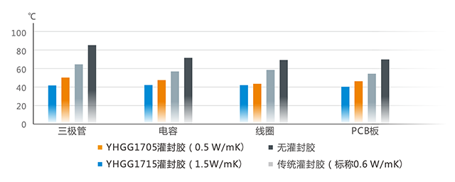 目前,元亨光電的石墨烯產(chǎn)品有石墨烯導(dǎo)熱硅脂、石墨烯導(dǎo)熱硅膠墊片、石墨烯導(dǎo)熱灌封膠,據(jù)有效測(cè)試顯示:電源上涂覆石墨烯導(dǎo)熱硅脂最高溫度是62.35℃,而涂覆傳統(tǒng)硅脂的電源最高溫度是68.18℃,相差5.83℃;當(dāng)使用導(dǎo)熱系數(shù)為5W/mK的石墨烯導(dǎo)熱硅膠墊片時(shí),電腦CPU溫度比使用傳統(tǒng)硅膠墊片的降低了5℃,并且隨著導(dǎo)熱系數(shù)的提高,兩者導(dǎo)熱、散熱能力差距將越來(lái)越明顯;灌封膠方面,其導(dǎo)熱效能對(duì)比圖如下: