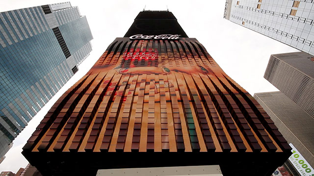 說到定制化,當(dāng)然少不了位于美國(guó)紐約時(shí)代廣場(chǎng)的可口可樂全球首款3D機(jī)械廣告牌,包括兩側(cè)顯示屏、可口可樂logo、正面顯示屏,視覺顯示器的整體表面面積為240.23平方米,其中側(cè)面屏和logo屏均為平面屏,正面主屏擁有1,760個(gè)移動(dòng)LED立方體,這些立方體可以獨(dú)立地向觀眾做伸出和縮回的運(yùn)動(dòng),根據(jù)展示內(nèi)容進(jìn)行編排。