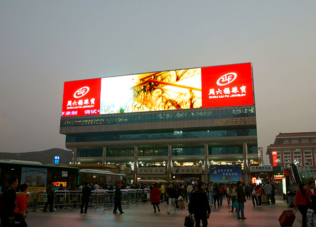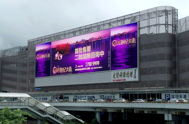 深圳皇崗口岸項(xiàng)目——安裝于2013年,顯示面積:747.07㎡,龐大的面積和線條簡(jiǎn)潔流暢的建筑相得益彰,成為當(dāng)?shù)刈盍恋娘L(fēng)景線。