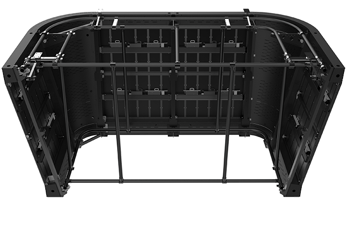 這塊吊斗屏是采用4mm像素間距制作而成的圓錐形吊斗屏,整屏由兩種箱體材質(zhì)打造而成,其中主箱體為1152*768mm的型材箱體,而為了確保箱體之間無(wú)縫連接,屏體頂部和底部箱體則采用規(guī)格為1152*192mm的鈑金箱體。
