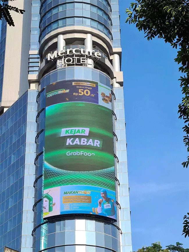 終年高溫多雨的赤道地區(qū)與鏤空、輕薄、高對(duì)比度、低風(fēng)阻的戶外顯示產(chǎn)品是絕配。佇立在日惹Grand Mercure 酒店外的元亨GD系列顯示屏,超過35%的面積采用鏤空設(shè)計(jì),能在提高產(chǎn)品透光率的同時(shí),極大地降低風(fēng)阻;獨(dú)特的斜角設(shè)計(jì)能有效降低顯示屏反光率,使其在烈日下的表現(xiàn)也同樣出色